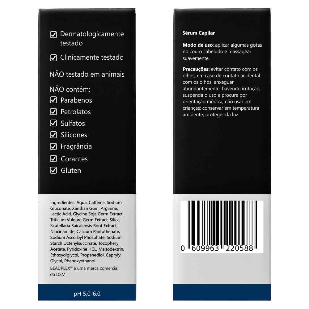 Sérum Capilar com 3% de Baicapil + 3% de Cafeína e 2% de Beauplex com alta eficácia na redução da queda e no crescimento do cabelo. INDICAÇÕES Principais » Reduzir a queda » Estimular o crescimento » Fortalecer os fios Complementares » Recuperar a pigmentação » Proporcionar volume Tipos de cabelo » Todos INGREDIENTES ATIVOS CAFEÍNA Um alcaloide metilxantina encontrado em diversas fontes de origem natural como grãos de café e folhas de chá. Com propriedades vasoconstritora, anti-inflamatória e antioxidante, tem alta eficácia contra olheiras e bolsas na área dos olhos, e na redução e clareamento de manchas na pele. Em formulações capilares, melhora a circulação sanguínea e inibe os efeitos do hormônio DHT, preservando os folículos e estimulando o crescimento do cabelo. BAICAPIL Associação de baicalina, composto com propriedades anti-inflamatórias utilizado na medicina tradicional chinesa, e outros ingredientes de origem botânica, que age nas células do folículo capilar, reduzindo a queda e estimulando o crescimento do cabelo. BEAUPLEX Composto com vitaminas B3, B5, B6, C e E, conhecido pelos benefícios para o couro cabeludo e pela eficácia na redução da queda, estimulo do crescimento, aumento da densidade e espessura do cabelo. MODO DE USO » Use diariamente, de preferência à noite Aplique a noite » Dispense algumas gotas no couro cabeludo, massageando suavemente » Evite lavar o cabelo após a aplicação » Evite contato com os olhos » Em caso de contato acidental com os olhos, enxague abundantemente » Não usar em crianças » Havendo irritação, suspenda o uso e procure por orientação médica » Conservar em temperatura ambiente, protegendo da luz DÚVIDAS FREQUENTES Contém parabenos, petrolatos e sulfatos? Não. Sua composição também não inclui silicones, fragrância, corantes nem glúten. Está regularizada na Anvisa? Sim, conforme o processo número 25351.452744-2022-71. Foi testada em animais? Não. A PRINCIPIA não realiza testes em animais. Qual o prazo de validade? Três anos, contados da data de fabricação. Pode ser usada junto com outras fórmulas? Sim, praticamente não há restrições para uso com outros ativos.